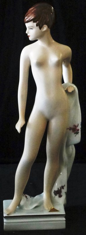 Royal Dux a nude women with short brown hair and a towel in her hand, with a size of 12 inches high. Royal Dux desnudo de mujer con una toalla y el pelo corto marrón, y con un tamaño de 12 pulgadas de alto.