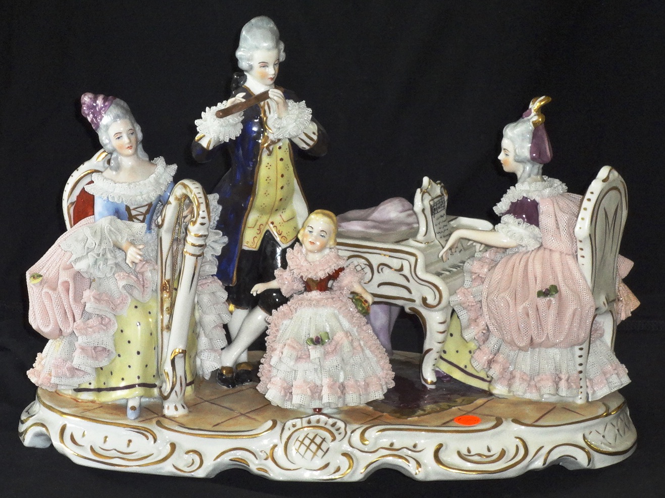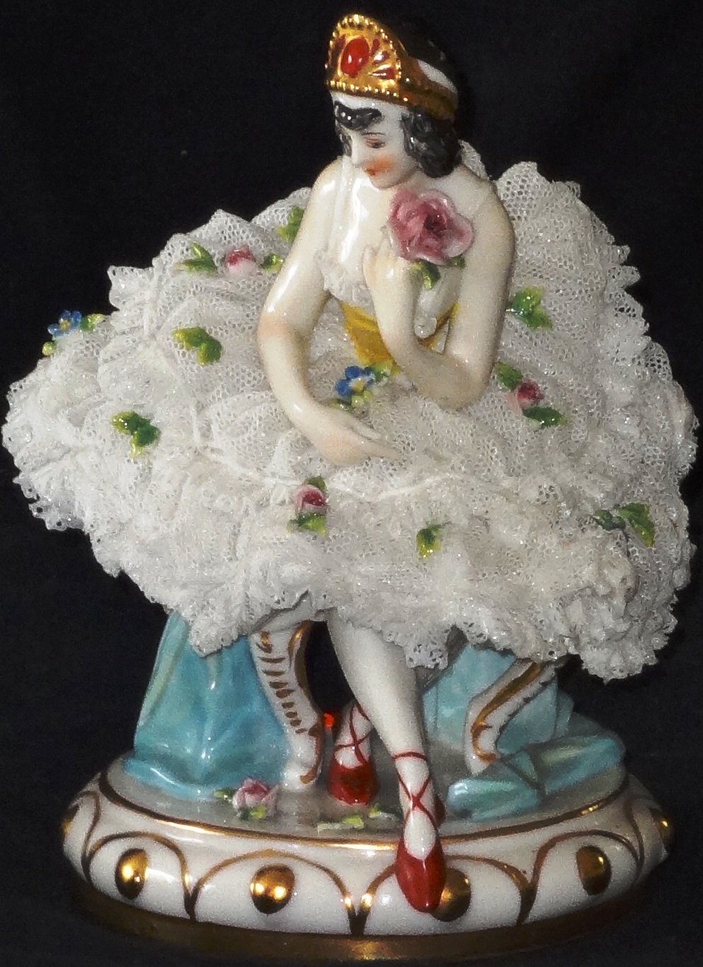 A ballerina seating in a pedestal with a nice dress and a size of 7 inches high. Bailarina sobre pedestal con vestido de encaje y flores, con un tamaño de 7…