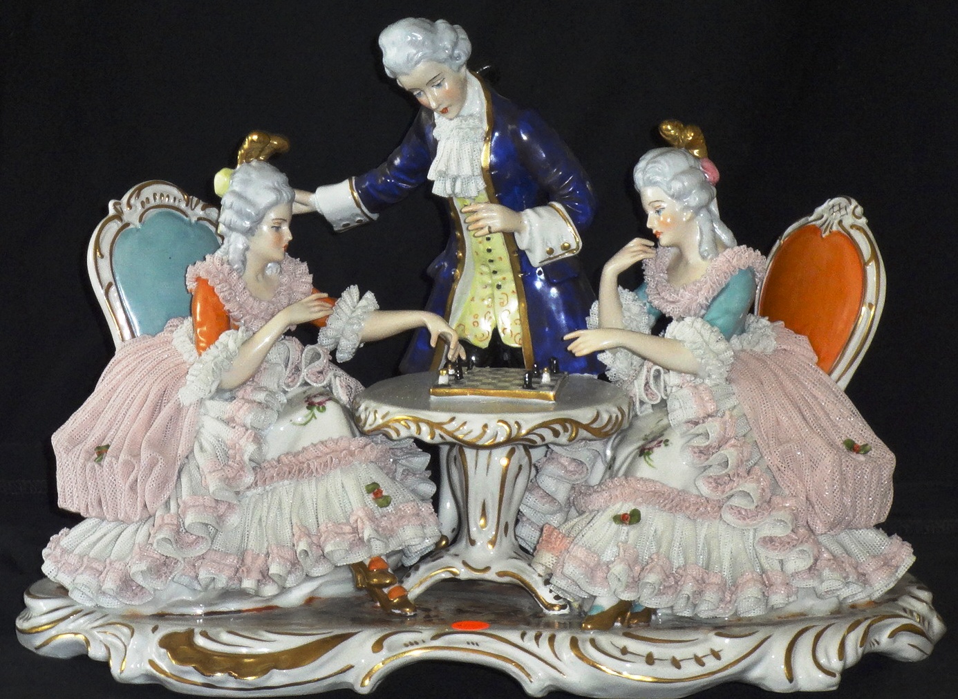 Dresden a group of two women and a man playing chess, with a size of 12 inches long. Dresden un grupo de dos mujeres sentadas y un hombre de pie jugando…
