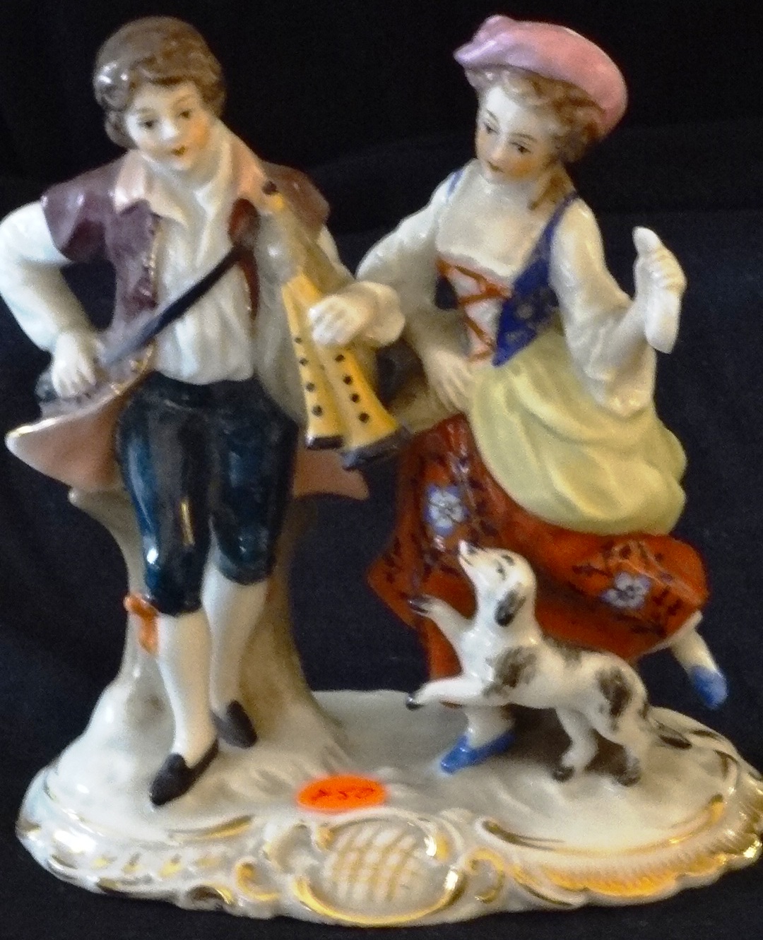 Sitzendorf a man and woman with a horn and a dog, with a size of 6 inches high. Sitzendorf una pareja de hombre y mujer con trompeta, y con un perro, de 6…