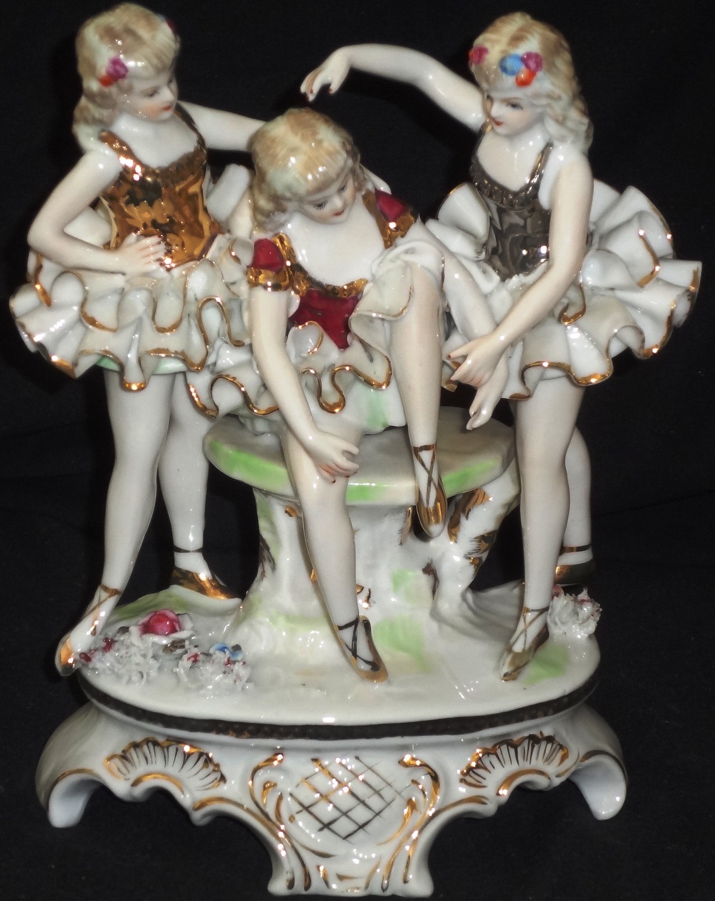 A group of three dancing and dressed ballerinas with a size of 8 inches high. Tres bailarinas de ballet en poses de baile y con vestido de encaje, y un tamaño…