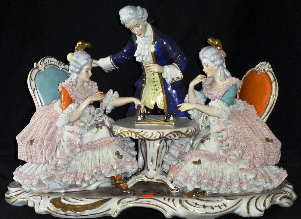 Dresden a group of two women and a man playing chess, with a size of 12 inches long. Dresden un grupo de dos mujeres sentadas y un hombre de pie jugando ajedréz, con un tamaño de 12 pulgadas de largo.