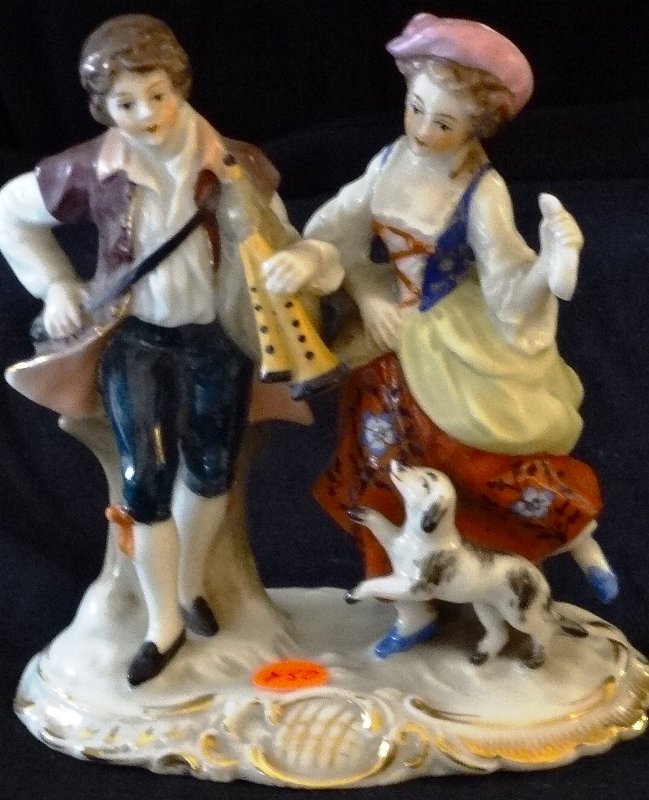 Sitzendorf a man and woman with a horn and a dog, with a size of 6 inches high. Sitzendorf una pareja de hombre y mujer con trompeta, y con un perro, de 6 pulgadas de alto.