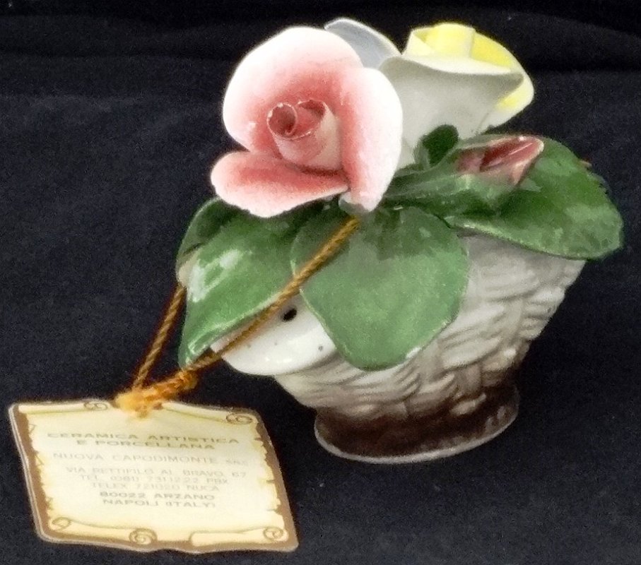 Capodimonte a small flower pot with red, yellow and pink flowers, with a size of 3 inches high and 2 inches long. Capodimonte un florero pequeño con flores variadas rojas, amarillas y rosadas, y un tamaño de 3 pulgadas de alto por 2 pulgadas de largo.