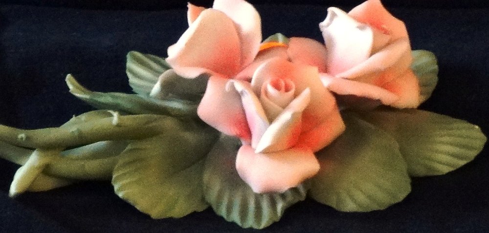 Napoleon Capodimonte a group of three pink roses on a branch with spines, with a size of 6 inches long. Napoleon Capodimonte un grupo de tres rosas rosadas sobre su ramo con espinas, y un tamaño de 6 pulgadas de largo.