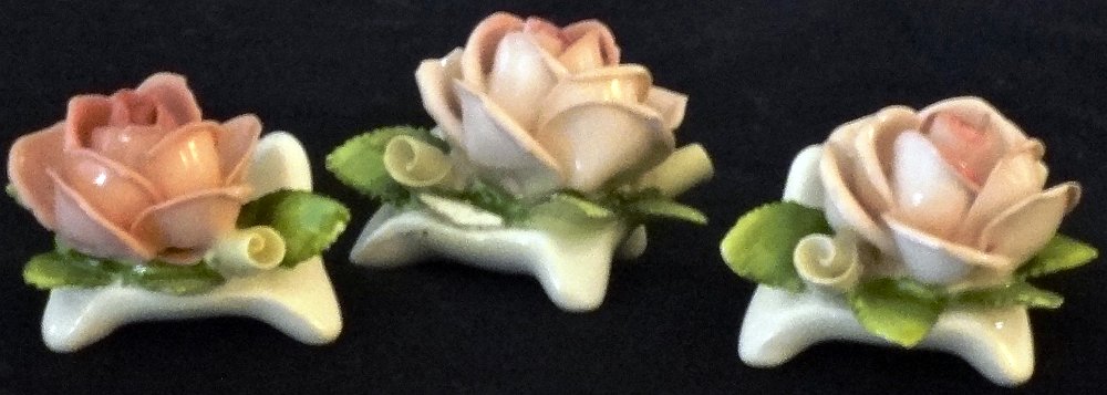 Capodimonte a set of 12 card holders for a dinner table in the form of pink roses, with a size of 2 inches high and long. Capodimonte un grupo de doce porta tarjetas para la mesa de cenar en forma de rosas rosadas, y un tamaño de 2 pulgadas de largo y de alto.