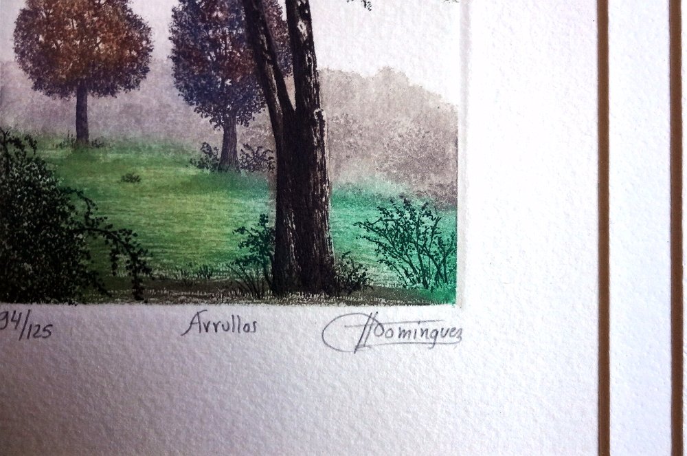 Dominguez Very beautiful hand colored lithograph with a landscape. Paper dimension is 6.5 by 6.5 inches and image dimension is 3.5 by 3.5 inches. Signed in pencil in the lower right side. Numbered 94/125 and titled "Arrullos". No frame. Muy hermosa litografía coloreada a mano con un paisaje. Dimensión del papel es 6.5 por 6.5 pulgadas y dimensión de la imagen es 3.5 por 3.5 pulgadas. Firmado a lápiz en la parte inferior derecha. Numerada 94/125 y titulada "Arrullos". Sin marco.