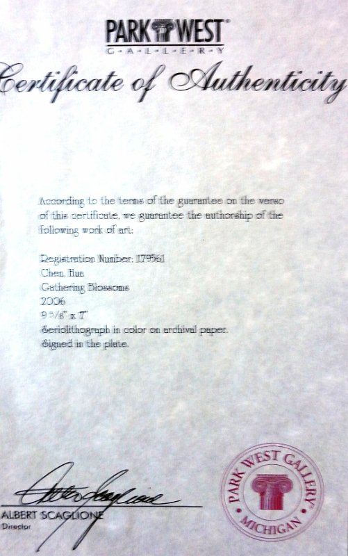 Work of art by Hua Chen, titled “Gathering Blossoms”. Serio lithograph/Print in color on Archival Paper. New with COA and envelope. Produced by Park West Galleries. It’s signed in the plate and comes with a Certificate of Authenticity from Park West Gallery. It also comes in its original envelope and one page with artist information sheet. Also included are the Registration number: 179561. It measures 7 by 9.5 inches (unframed). The print is on paper 9 by 11.25 inches. En español Obra de arte titulada "Recopilación de Flores". Serio litografía o impresión en color en papel de archivo. Nuevo con COA y el sobre. Producido por Park West Galerías. Se firmó en la placa y viene con un certificado de autenticidad de Park West Gallery. Incluye su envoltorio original y una página con la hoja de información del artista. Se incluye el número de registro: 179561. Mide 7 por 9.5 pulgadas (sin marco). La impresión es en papel 9 por 11.25 pulgadas.