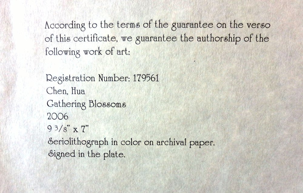 Work of art by Hua Chen, titled “Gathering Blossoms”. Serio lithograph/Print in color on Archival Paper. New with COA and envelope. Produced by Park West Galleries. It’s signed in the plate and comes with a Certificate of Authenticity from Park West Gallery. It also comes in its original envelope and one page with artist information sheet. Also included are the Registration number: 179561. It measures 7 by 9.5 inches (unframed). The print is on paper 9 by 11.25 inches. En español Obra de arte titulada "Recopilación de Flores". Serio litografía o impresión en color en papel de archivo. Nuevo con COA y el sobre. Producido por Park West Galerías. Se firmó en la placa y viene con un certificado de autenticidad de Park West Gallery. Incluye su envoltorio original y una página con la hoja de información del artista. Se incluye el número de registro: 179561. Mide 7 por 9.5 pulgadas (sin marco). La impresión es en papel 9 por 11.25 pulgadas.