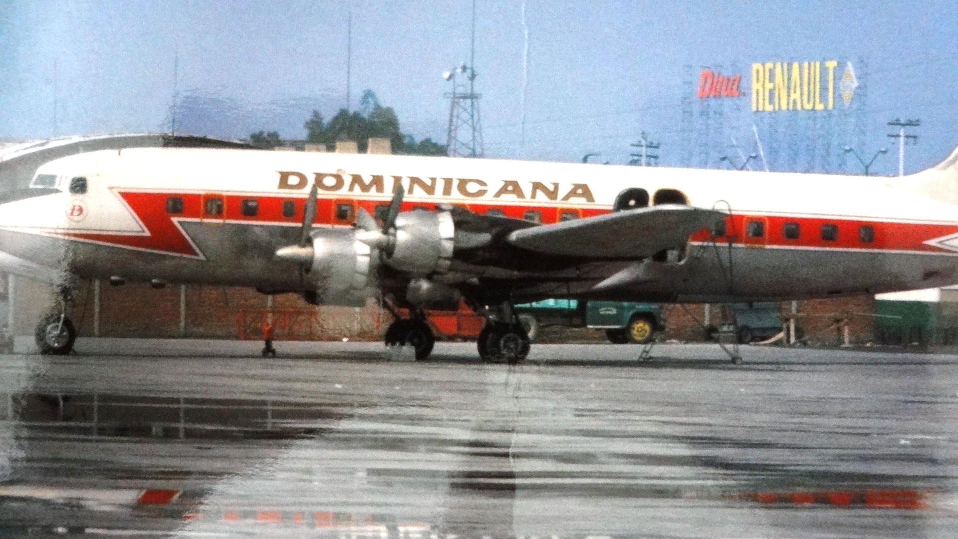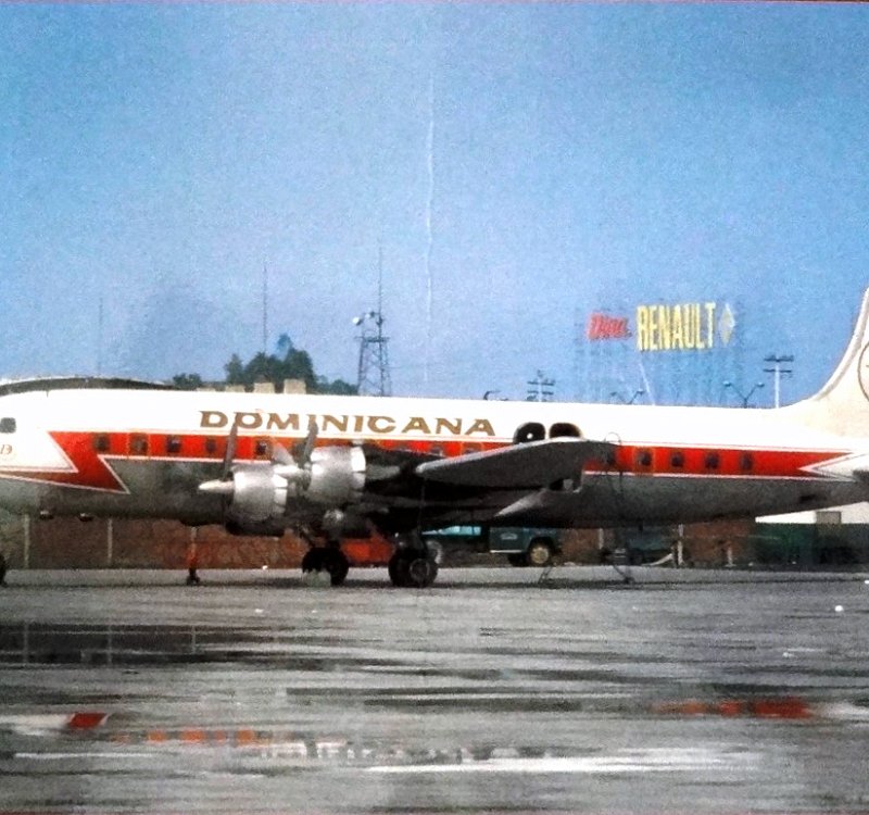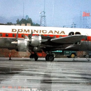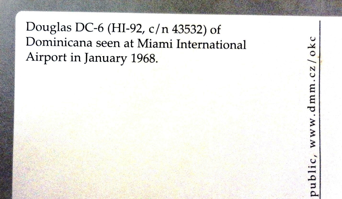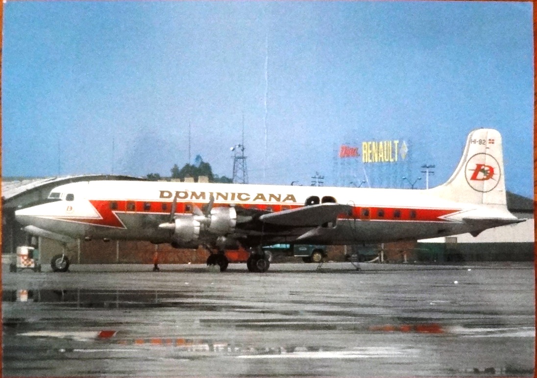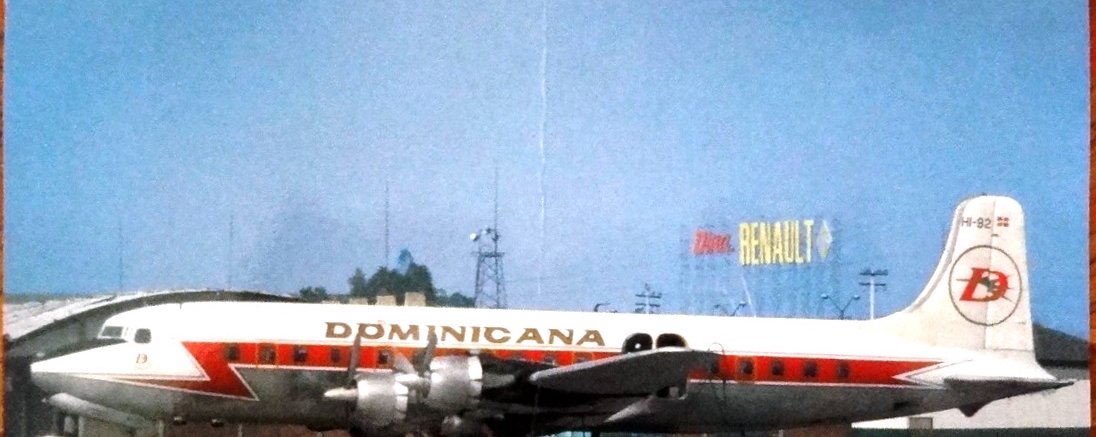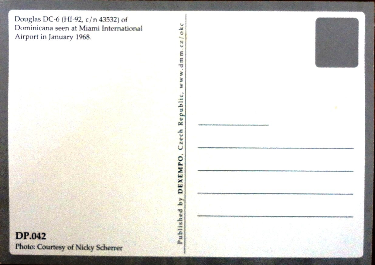Color post card with an air plane for the Dominicana Airlines. Dimension is 4 by 6.5 inches.
