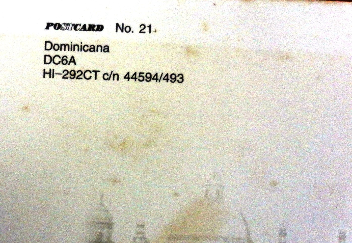 Color post card with a type DC6 air plane from the airline Dominicana de Aviación. Dimension is 4 by 6.5 inches.