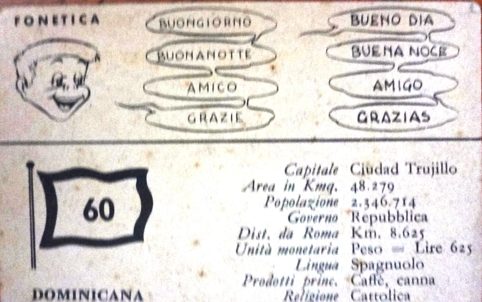 Small color post card with country information for Italian tourists visiting the Dominican Republic. Dimension is 2.5 by 3.5 inches.