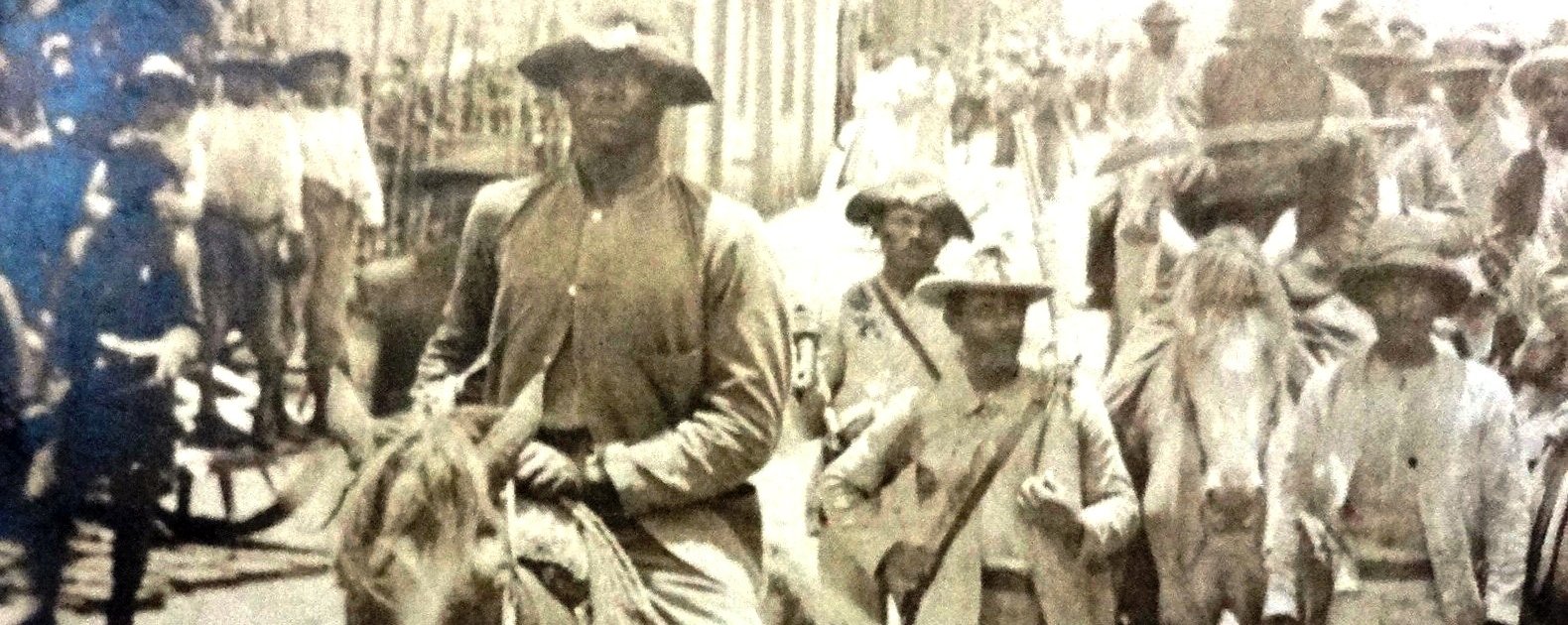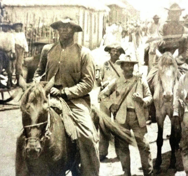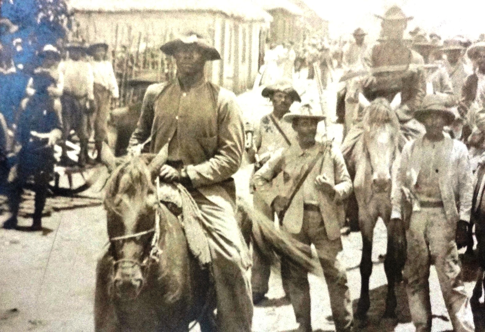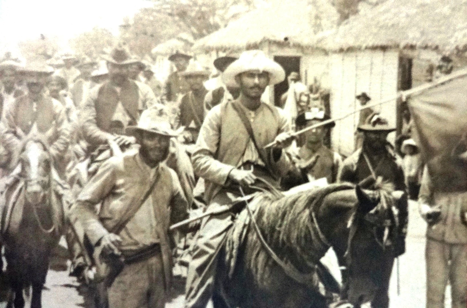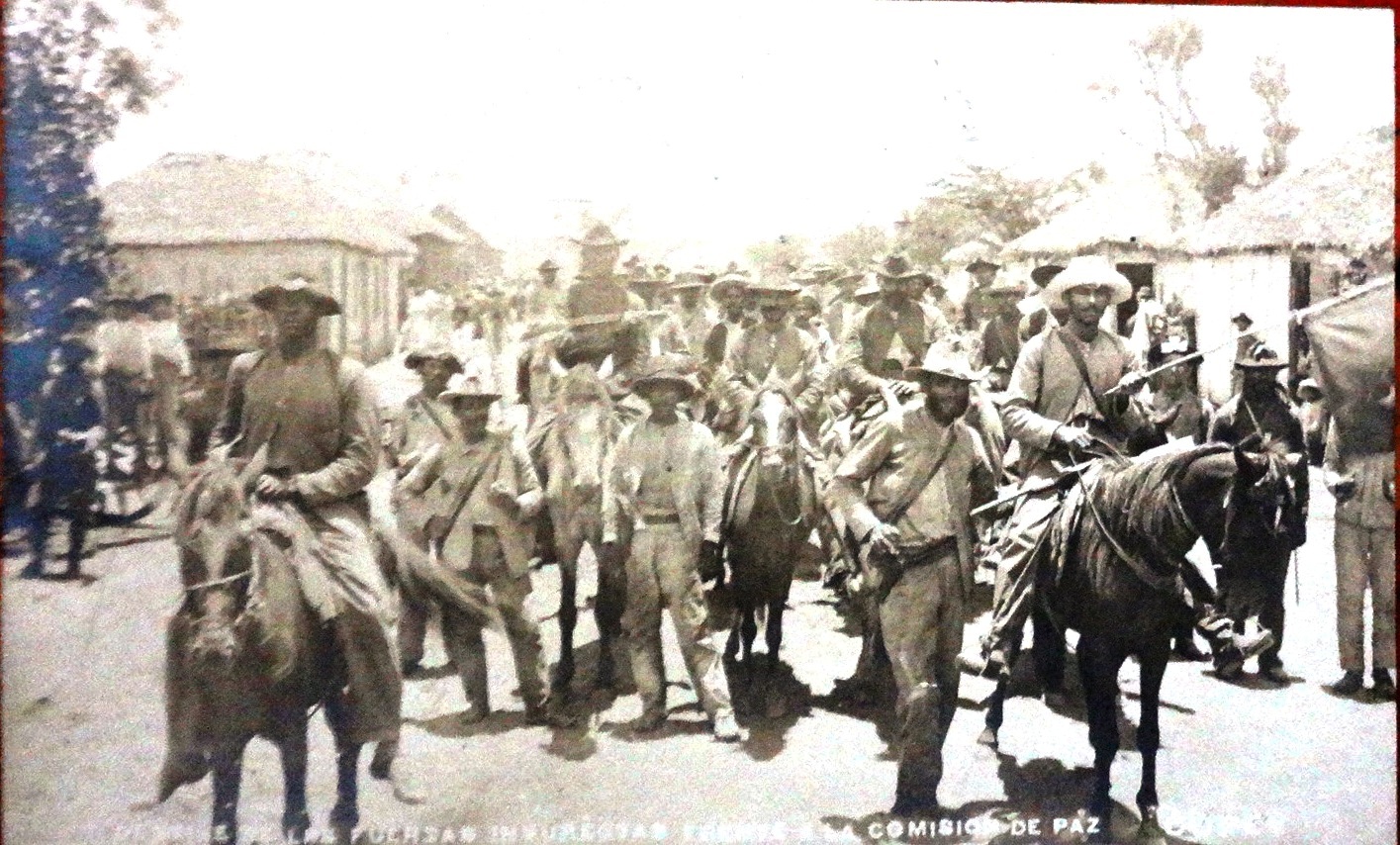 Black and white post card with a view of the insurect forces in front of the Peace Commission, Copey 1906. Dimension is 3.5 by 5.5 inches.