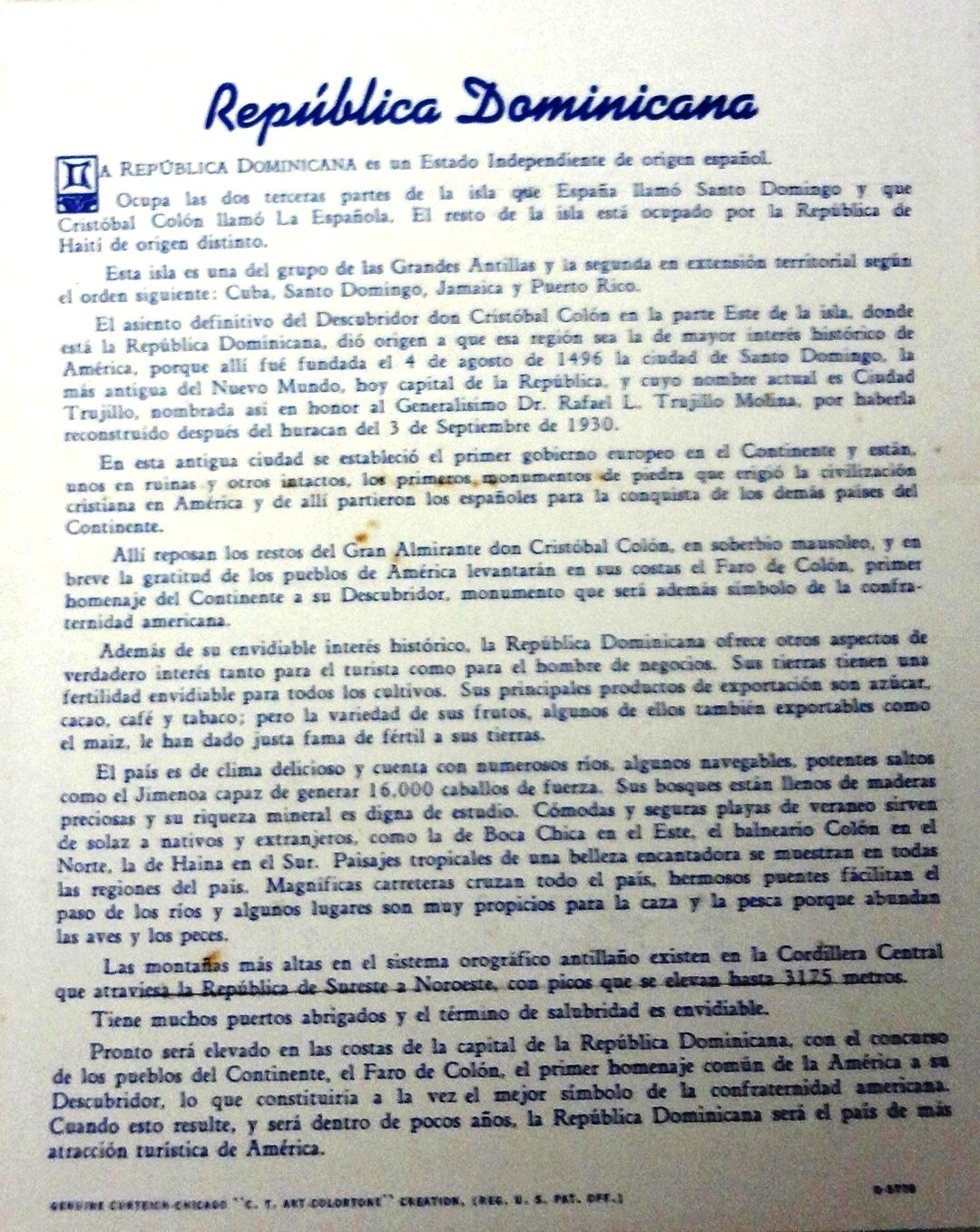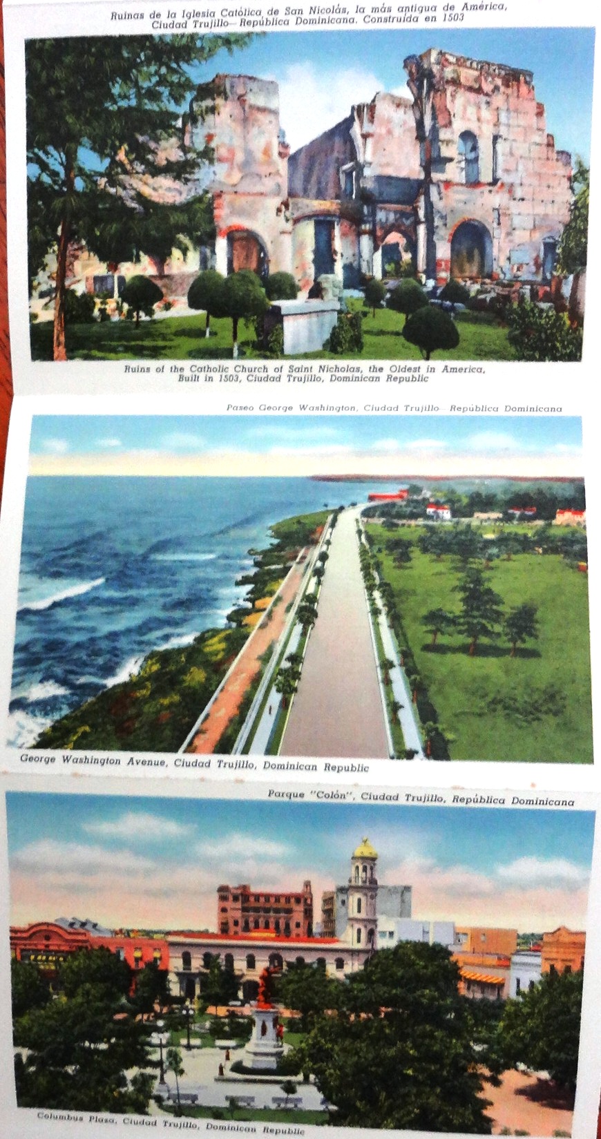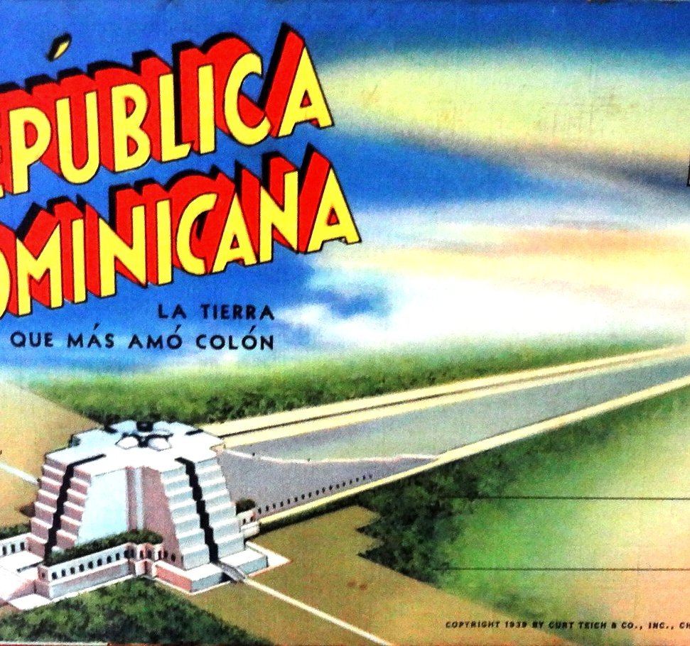Postal a color con fotos de varias localidades turísticas de la República Dominicana. Dimensión es 3.5 por 5 pulgadas.