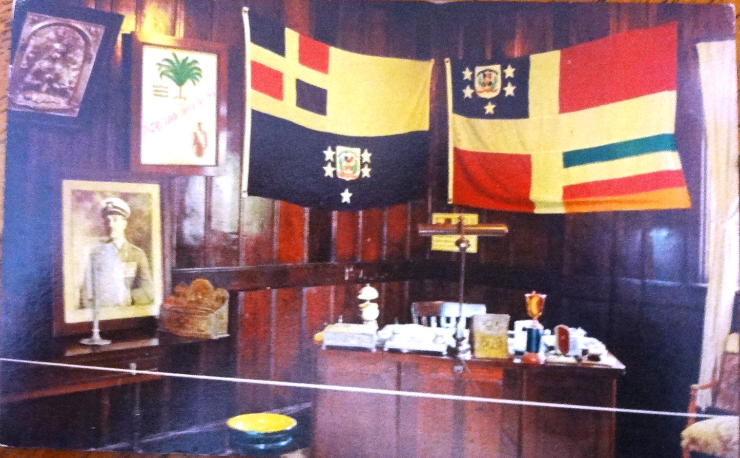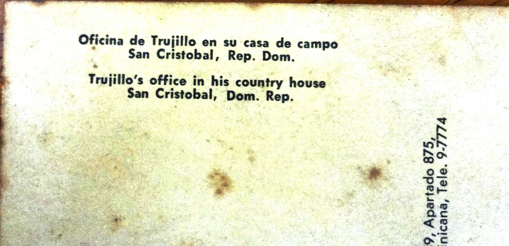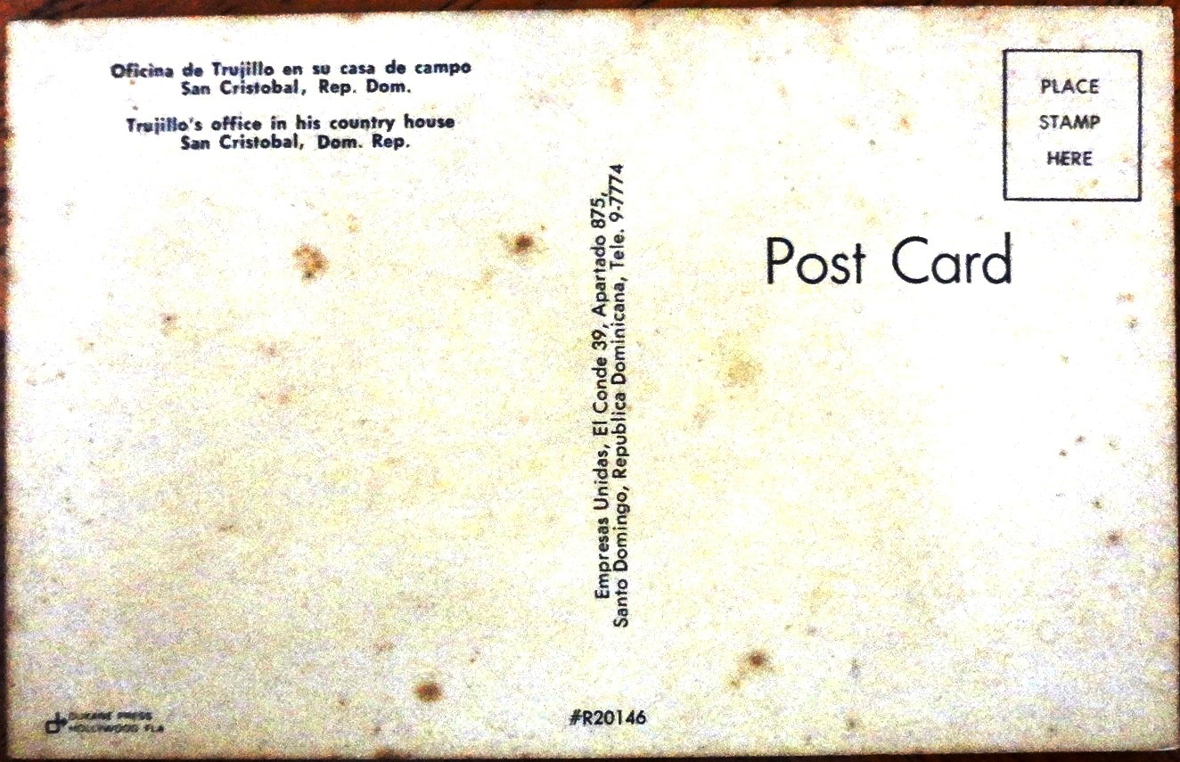 Color post card with the Office of Dictator Refael Leonidas Trujillo in the city of San Cristobal. The dimension is 3.5 by 5.5 inches.