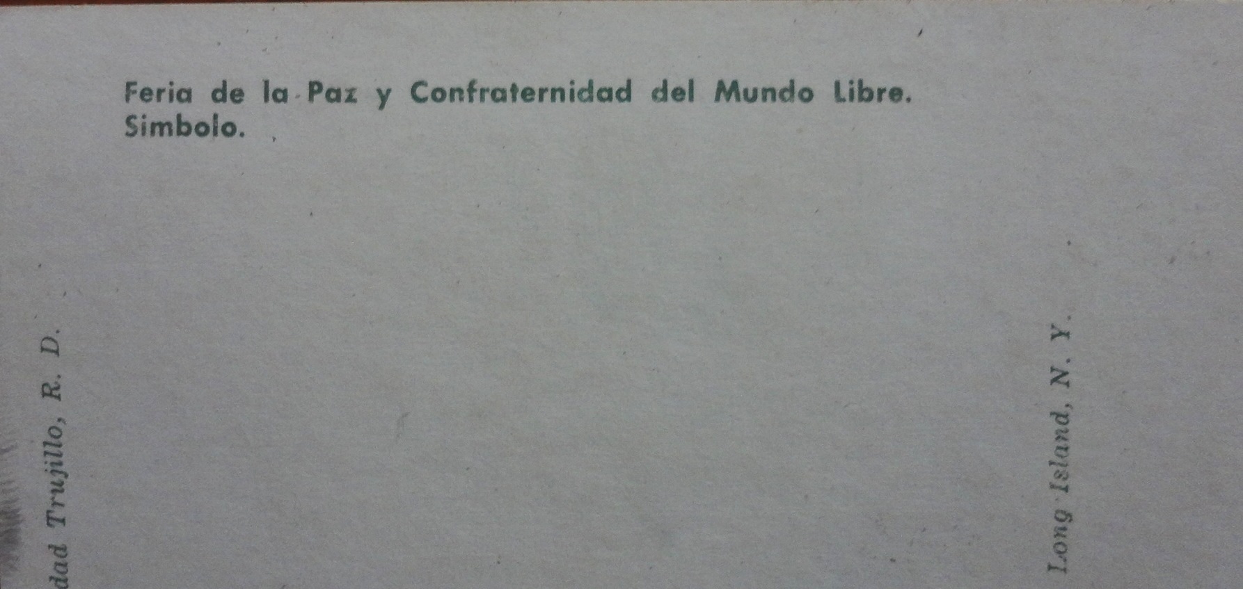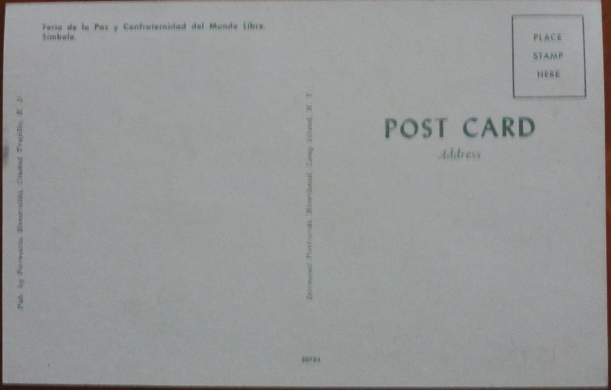 Color post card for the Peace and Confraternity Fair in the years 1955-56 in Ciudad Trujillo. Dimension is 3.5 by 5.5 inches.