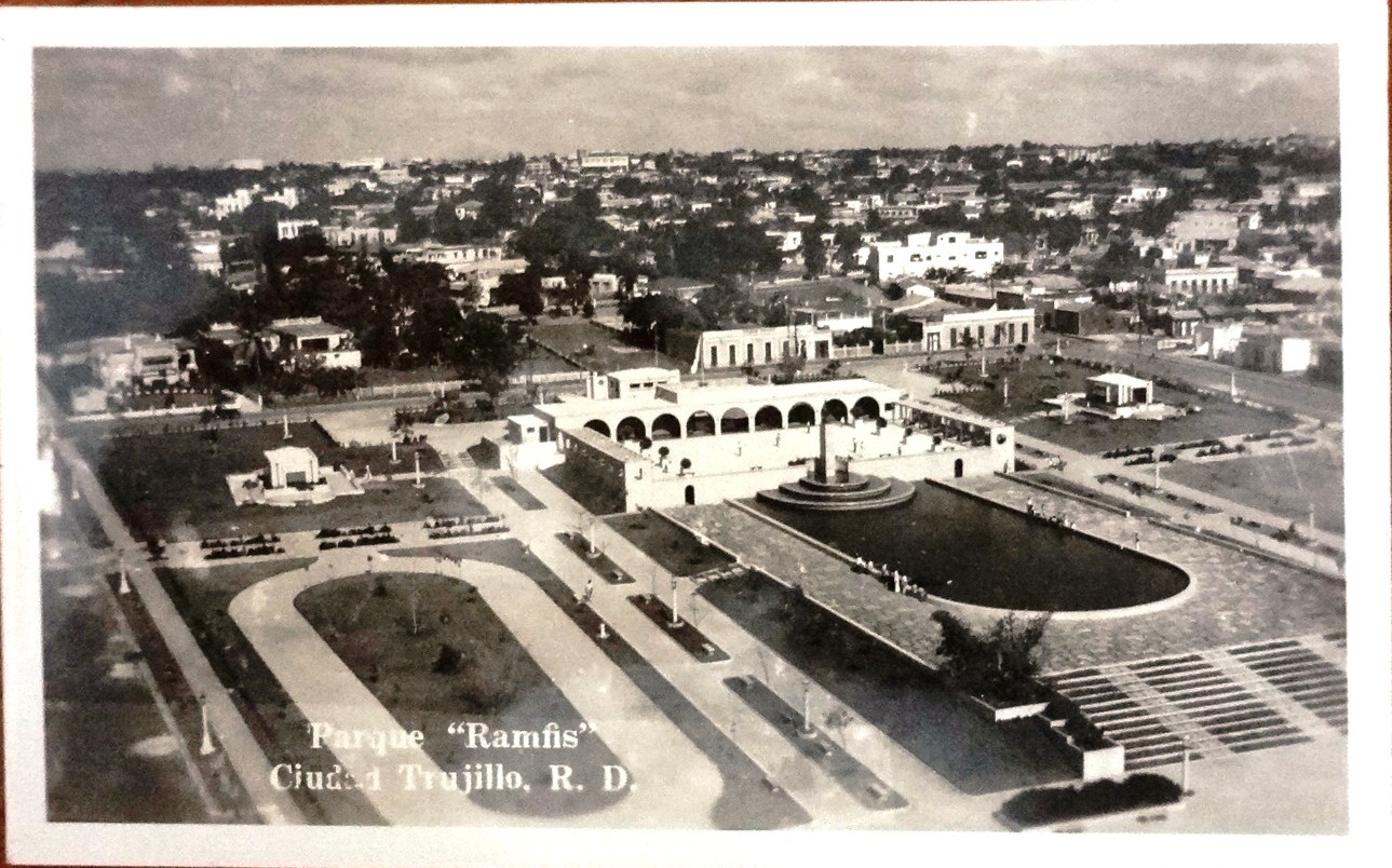 Postal a color con el Parque Ramfis localizado frente al mar en Ciudad Trujillo. Dimensión es 3.5 por 5.5 pulgadas.