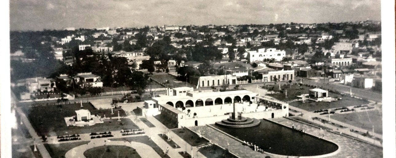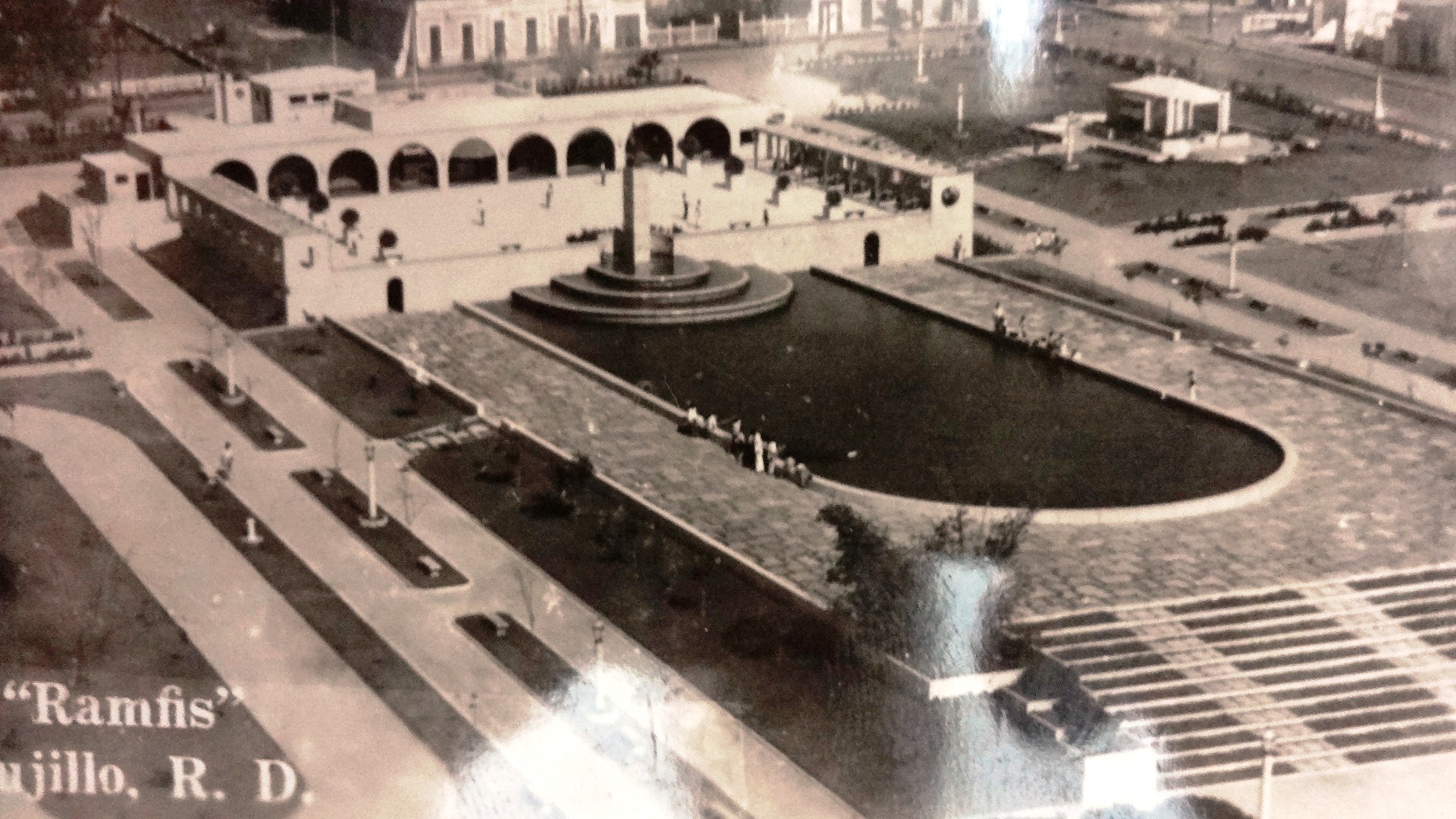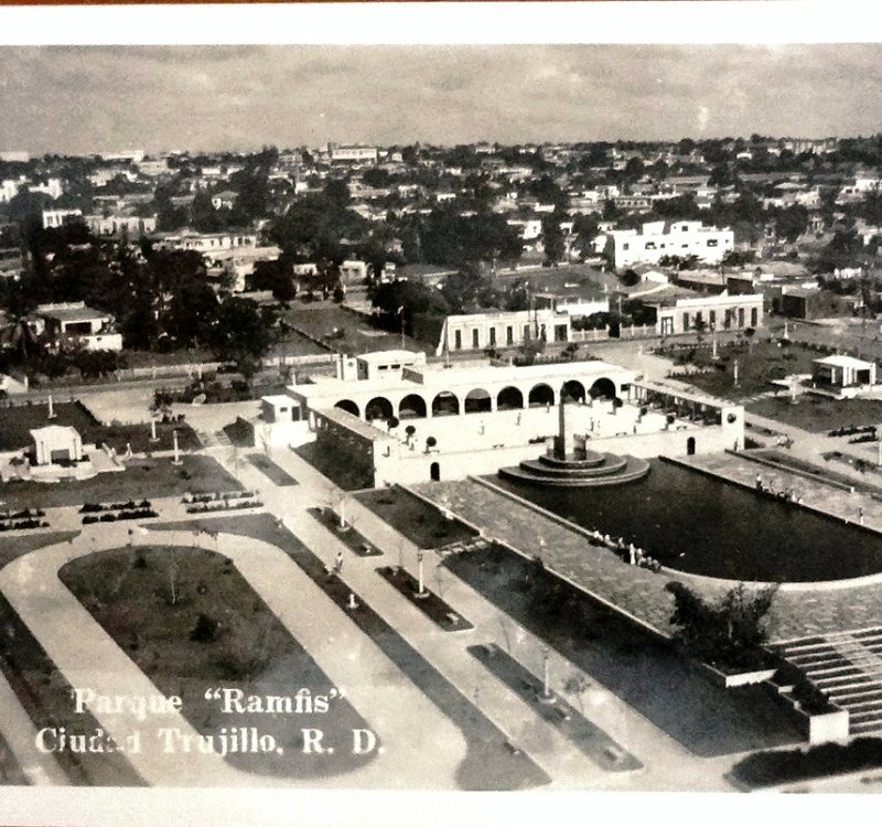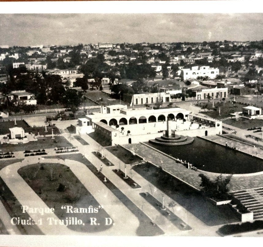 Black and white post card with the ocean front Ramfis Park located in Ciudad Trujillo. Dimension is 3.5 by 5.5 inches.