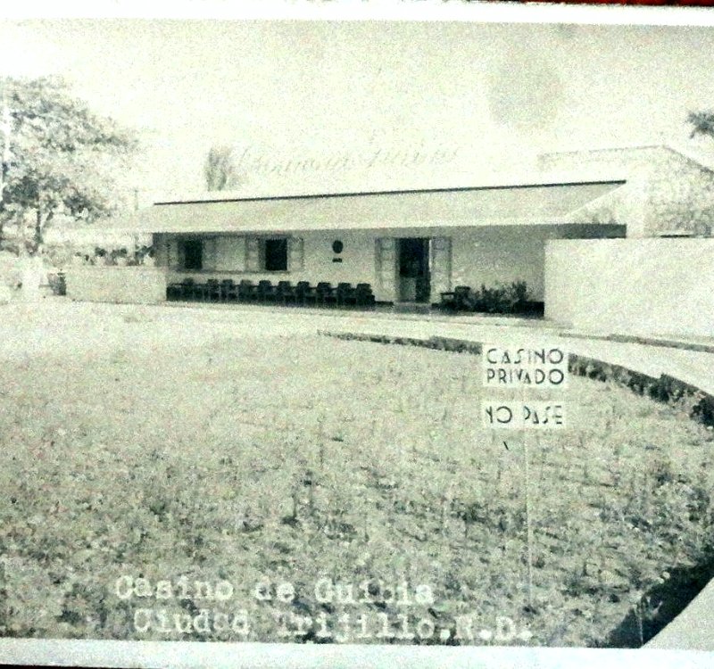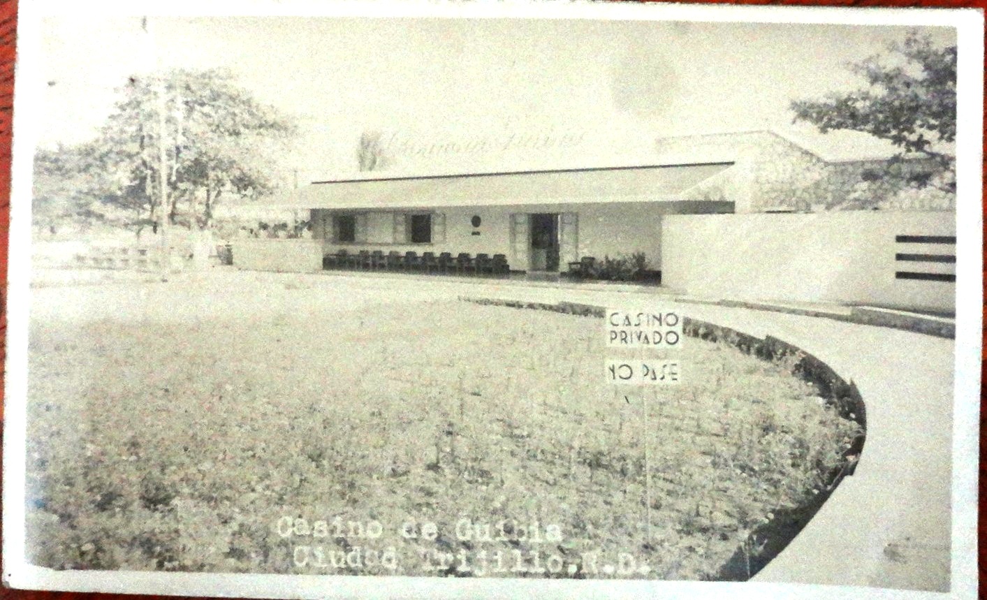 Black and white post card with the ocean front avenue of the Guibia Casino in Ciudad Trujillo. Dimension is 3.5 by 5.5 inches.