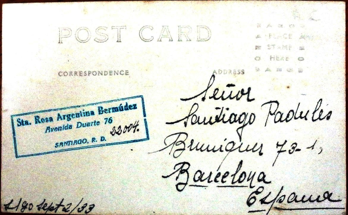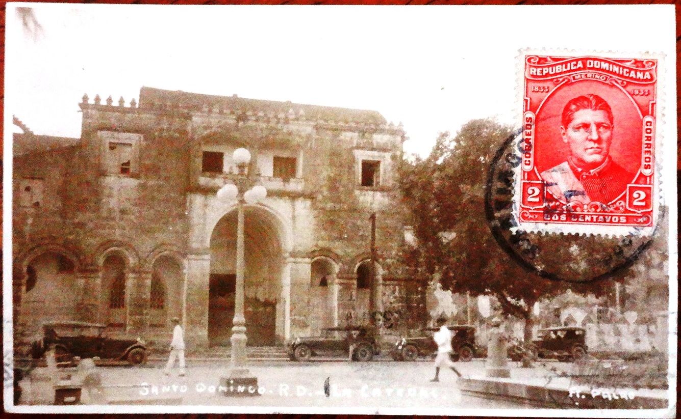 Postal en blanco y negro con la Catedral Primada de America en Ciudad Trujillo. Dimensión es 3.5 por 5.5 pulgadas.