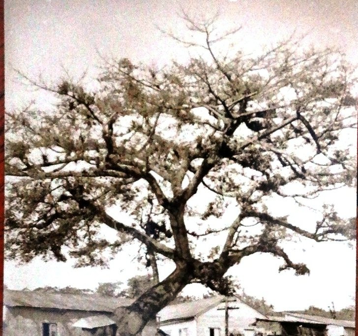 Postal en blanco y negro con el histórico árbol llamado La Ceiba de Colon, donde amarraba sus barcos. Dimensión es 3.5 por 6 pulgadas.
