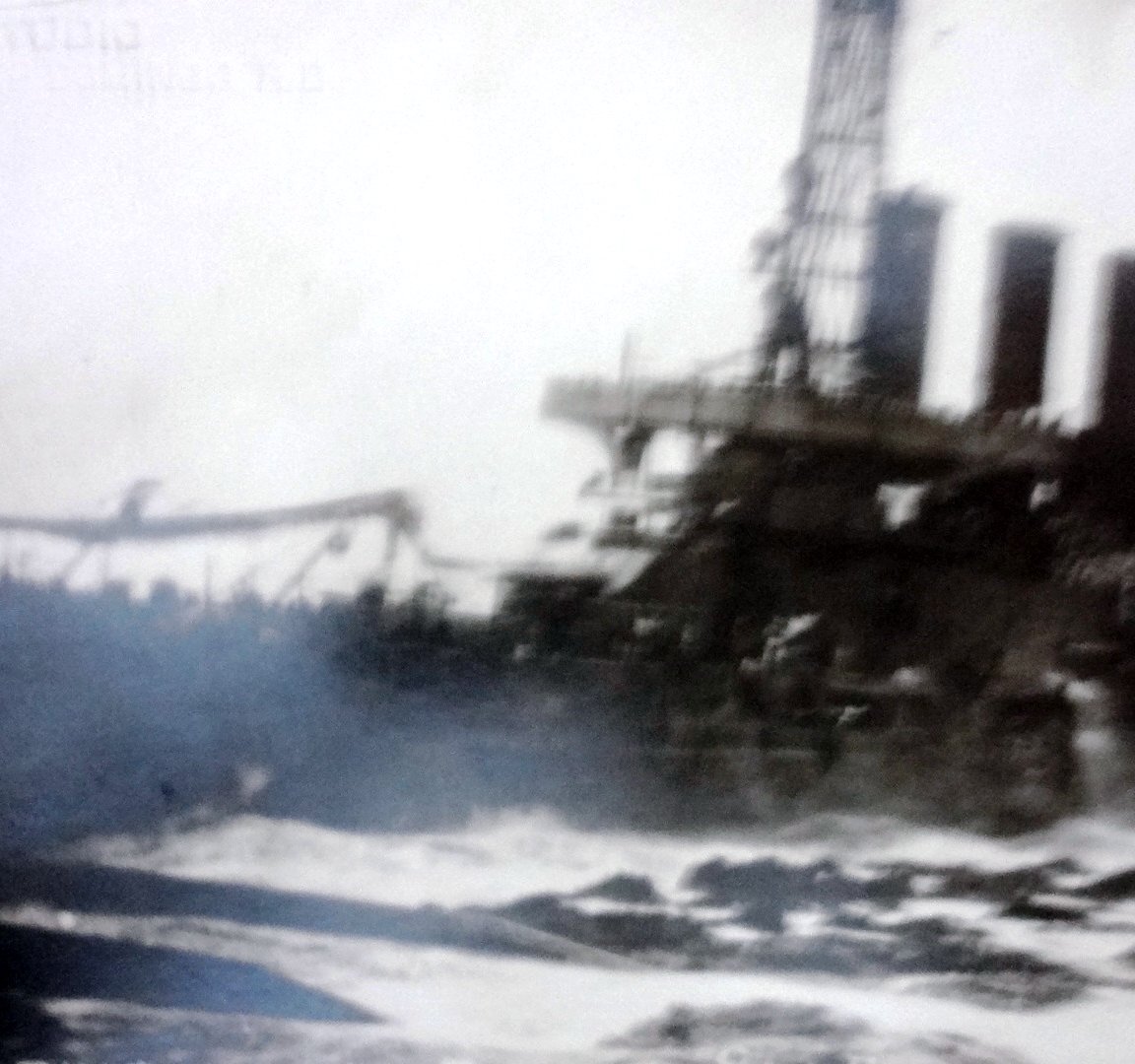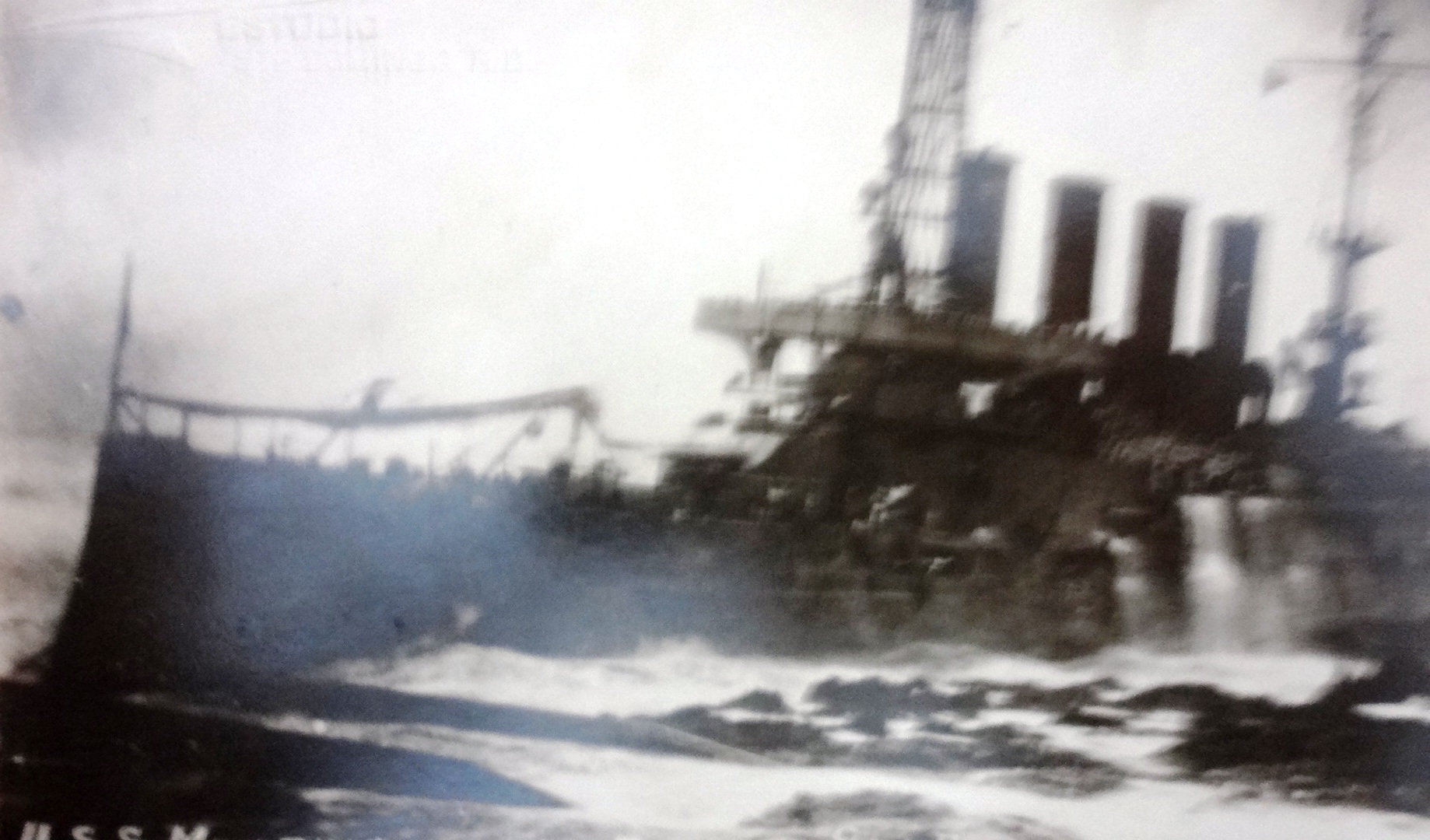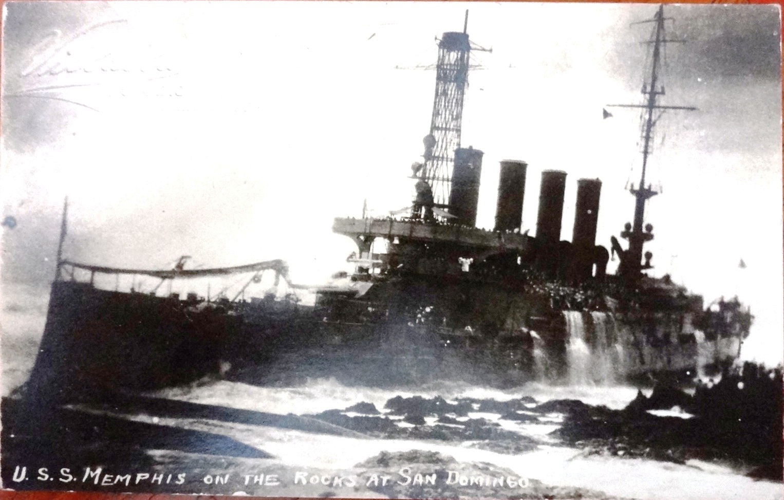 Black and white post card with the USS Memphis stranded at the rocks in San Domingo. Dimension is 3.5 by 5.5 inches.
