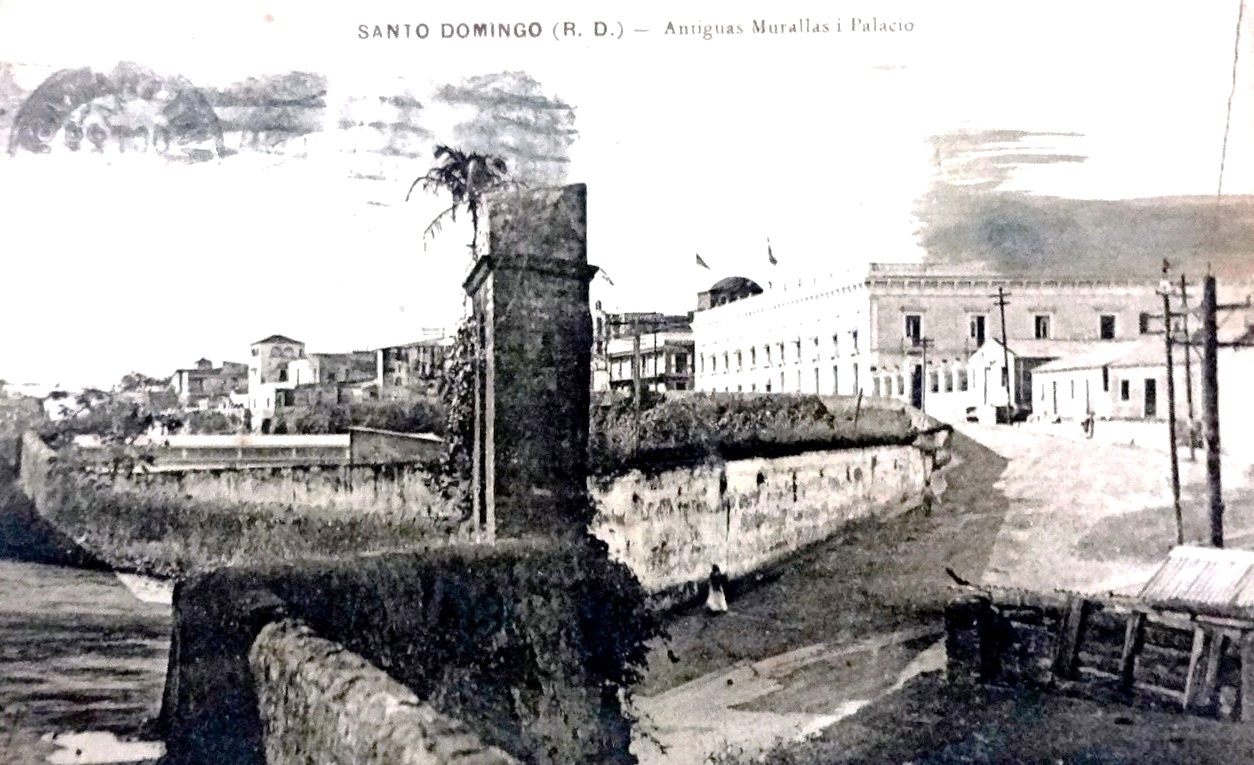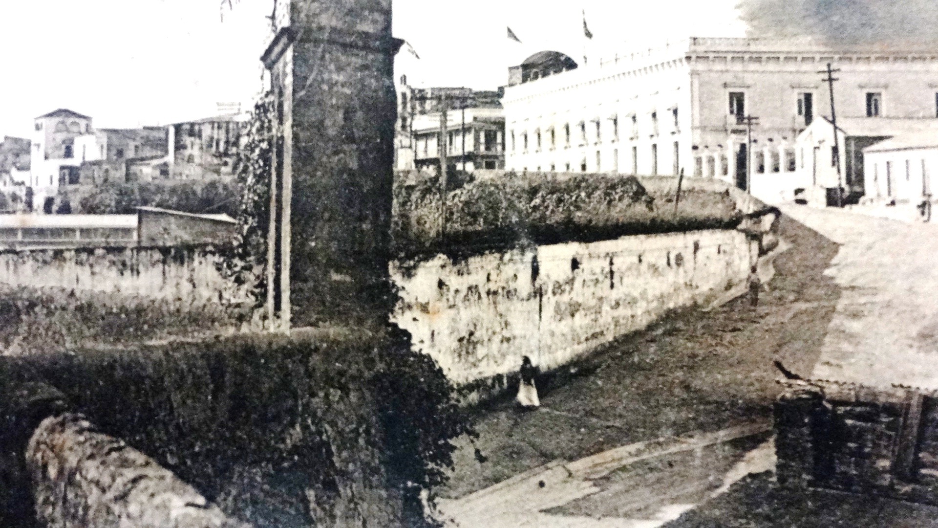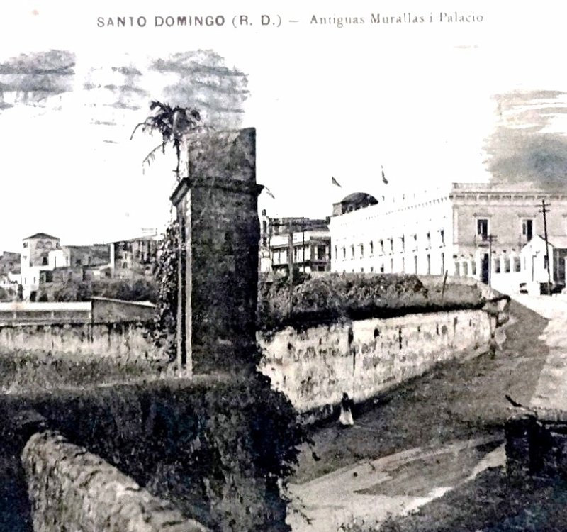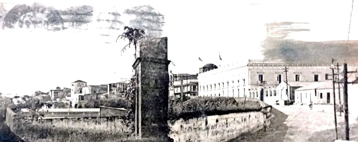 Postal en blanco y negro con la muralla antigua de la ciudad. Dimensión es 3.5 por 5.5 pulgadas.