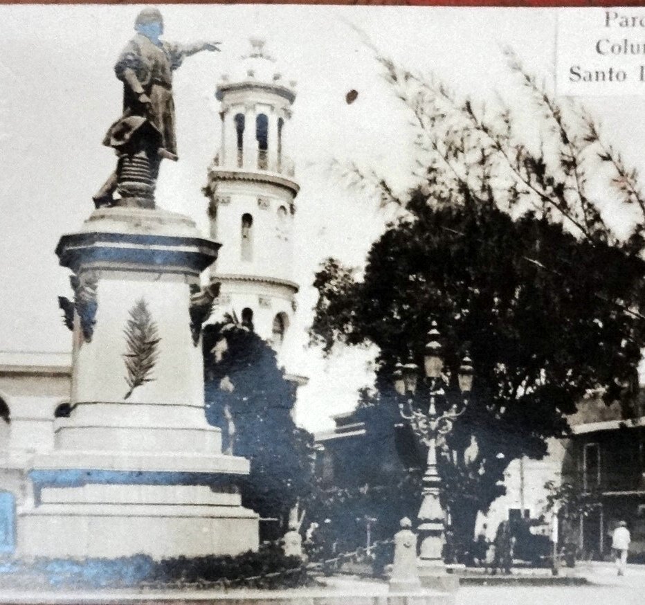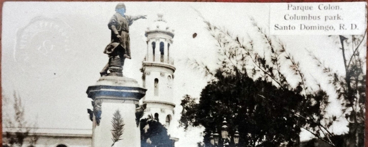 Black and white post card with the Colon Park in the center of the old city of Santo Domingo. Dimension is 3.5 by 6 inches.