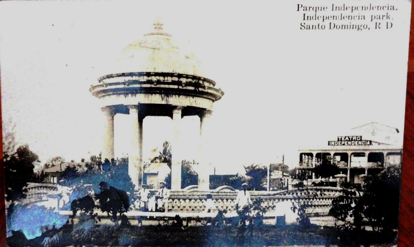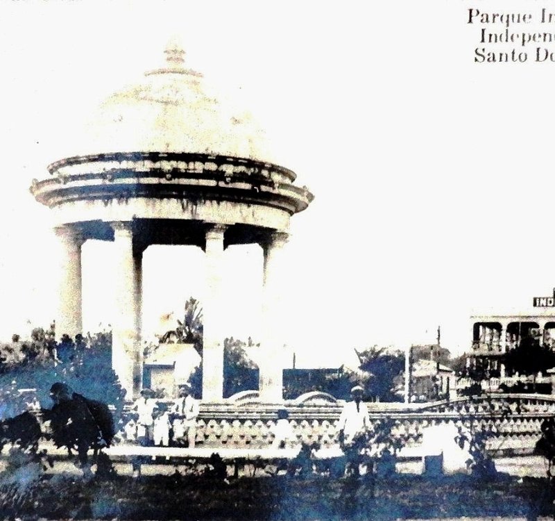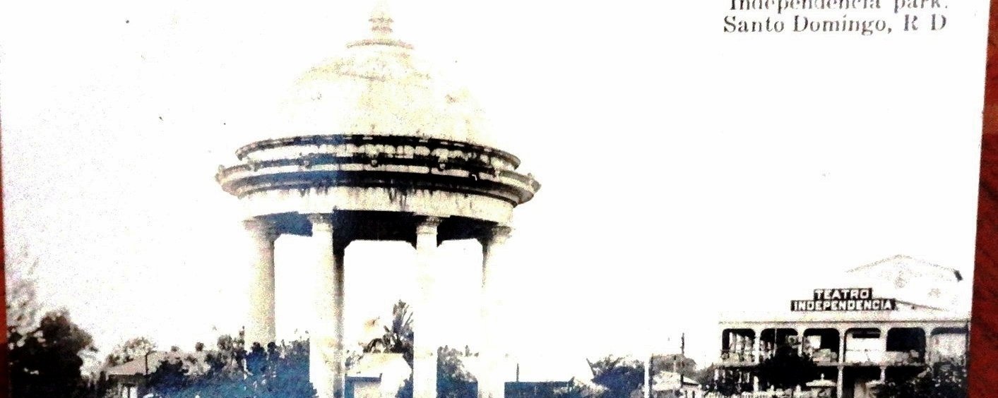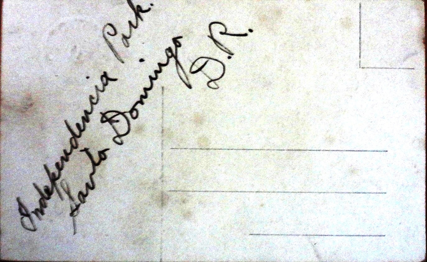 Postal en blanco y negro con el Parque Independencia en el centro de la Ciudad Trujillo. Dimensión es 3.5 por 6 pulgadas.