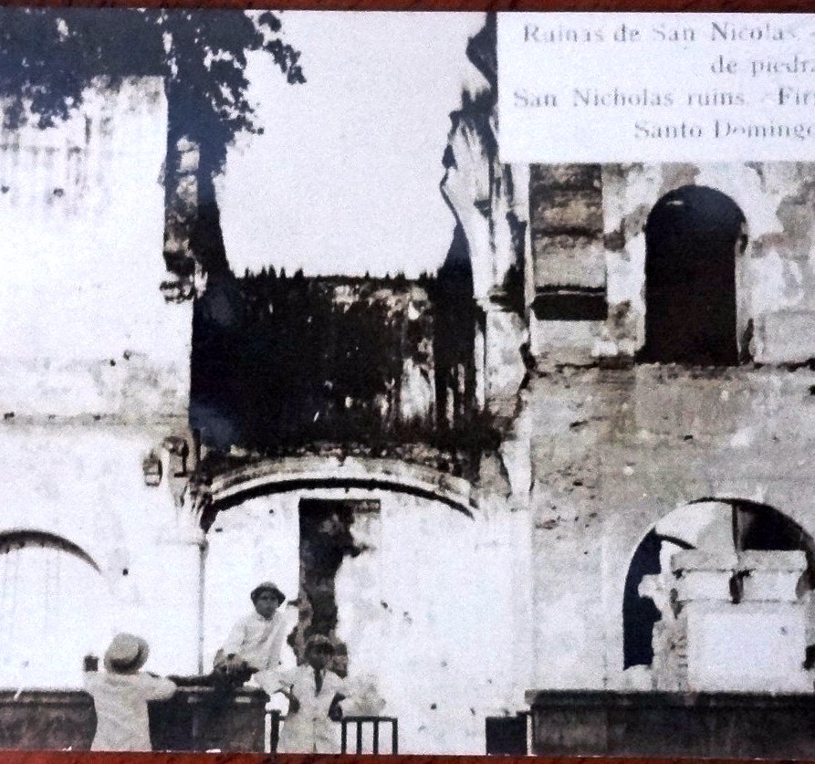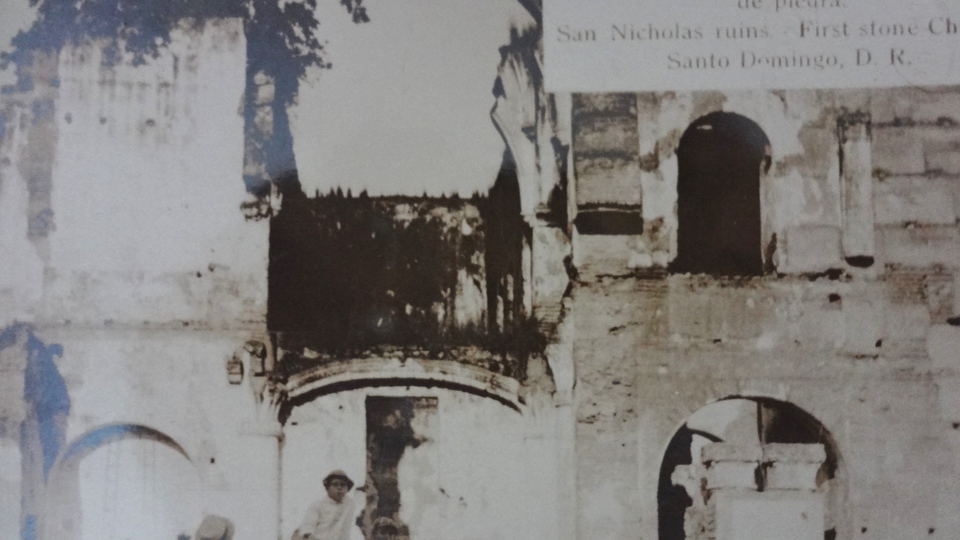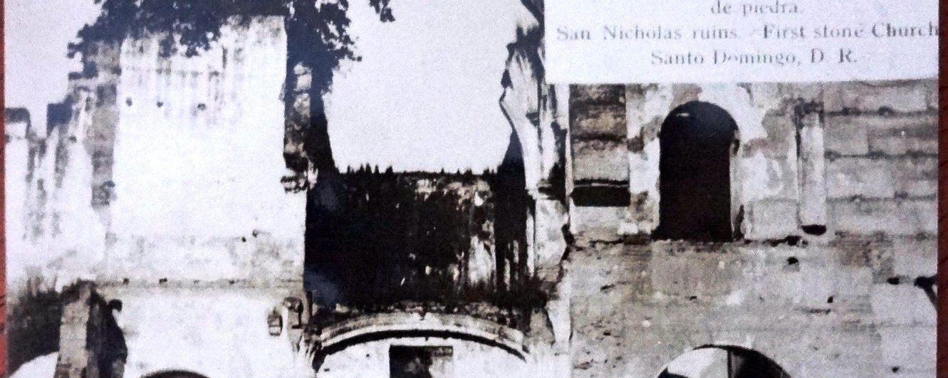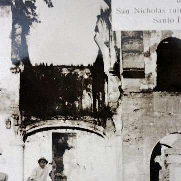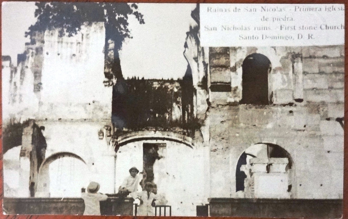 Postal en blanco y negro con las Ruinas de San Nicolas siendo la primera Iglesia de piedra del Continente Americano. Dimensión es 3.5 por 5.5 pulgadas.