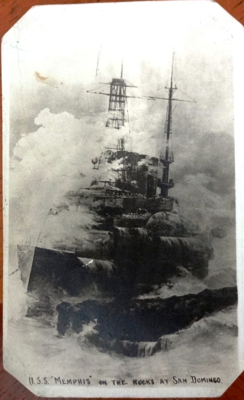 Black and white post card with the USS Memphis stranded at the rocks in San Domingo. Dimension is 3.5 by 5.5 inches.
