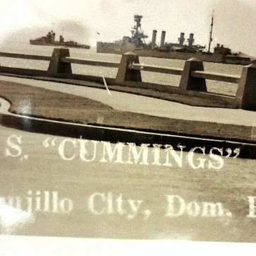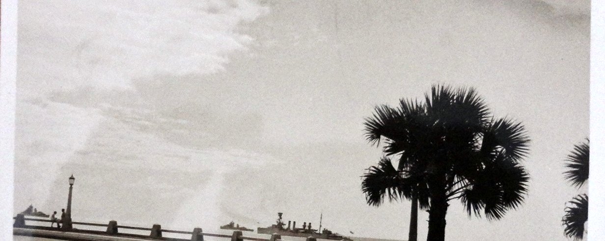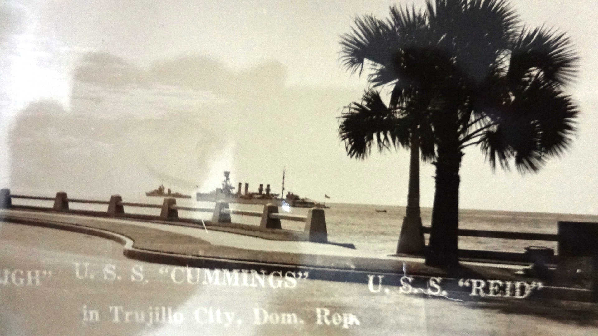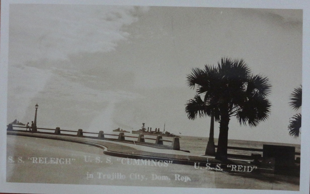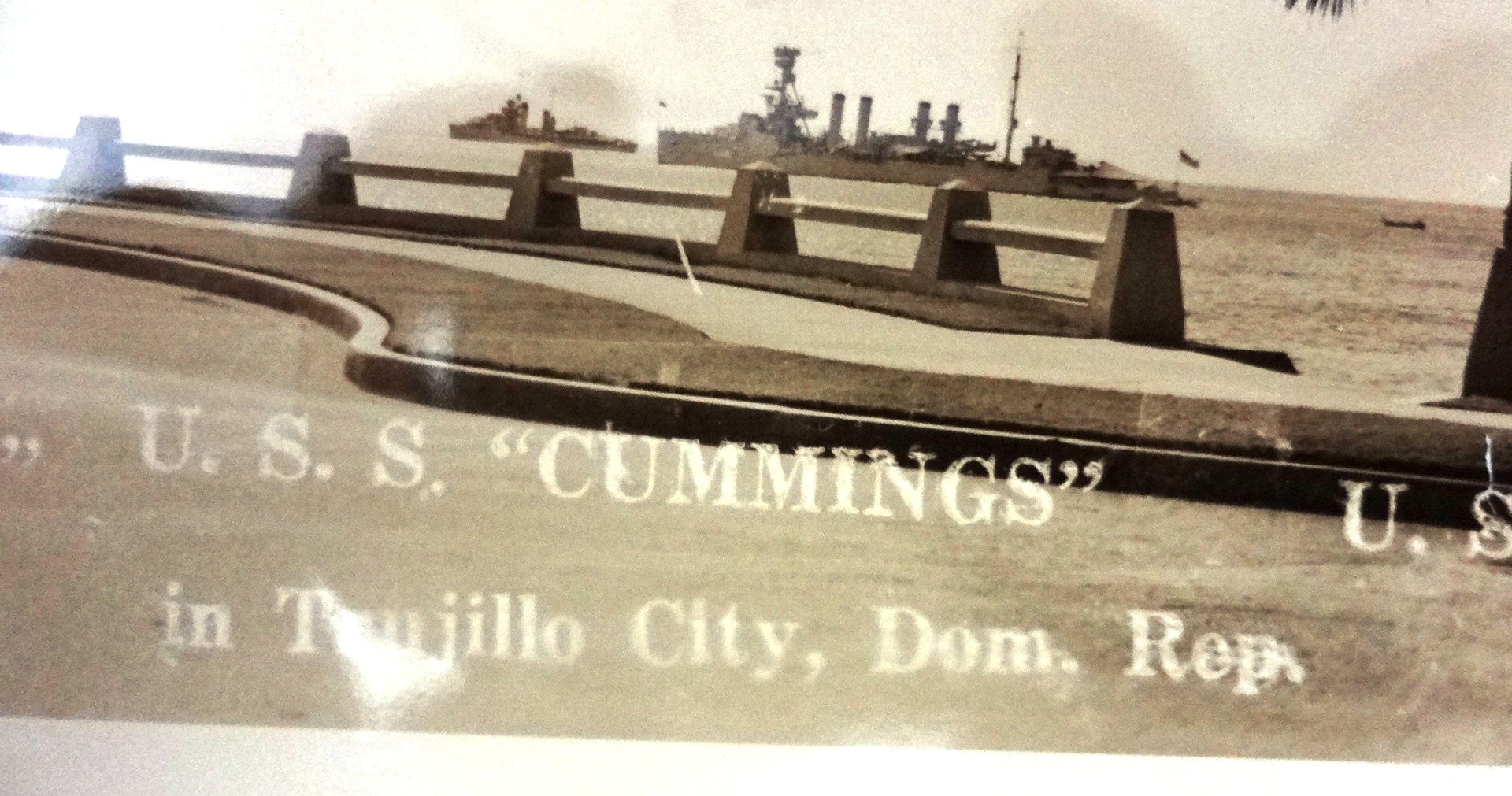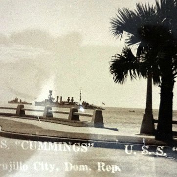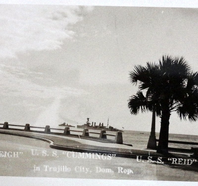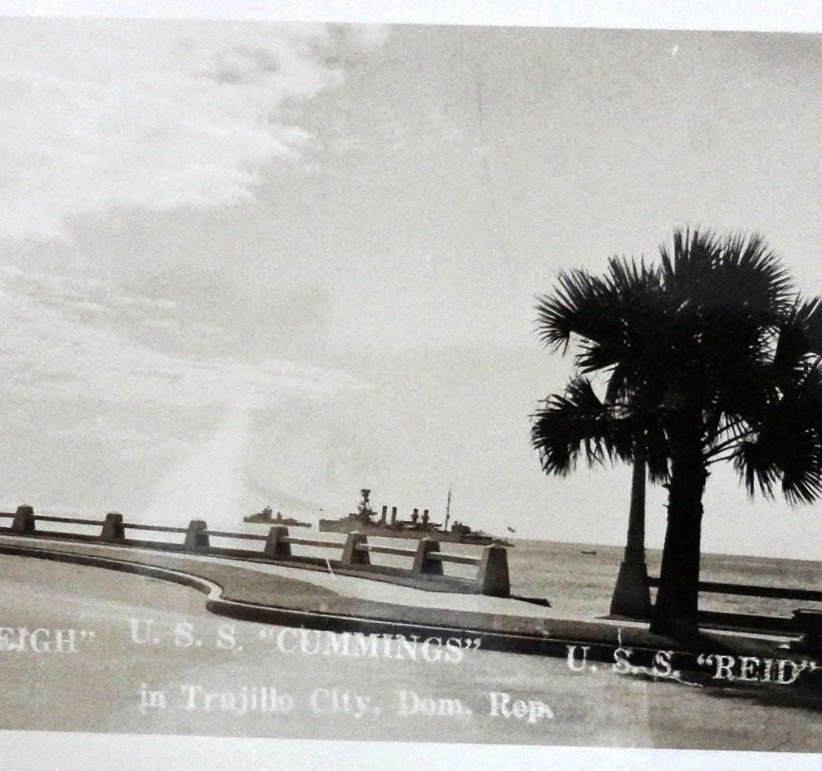 Postal en blanco y negro con una vista desde el Malecón de varios USS barcos de guerra norteamericanos. Dimensión es 3.5 por 5.5 pulgadas.